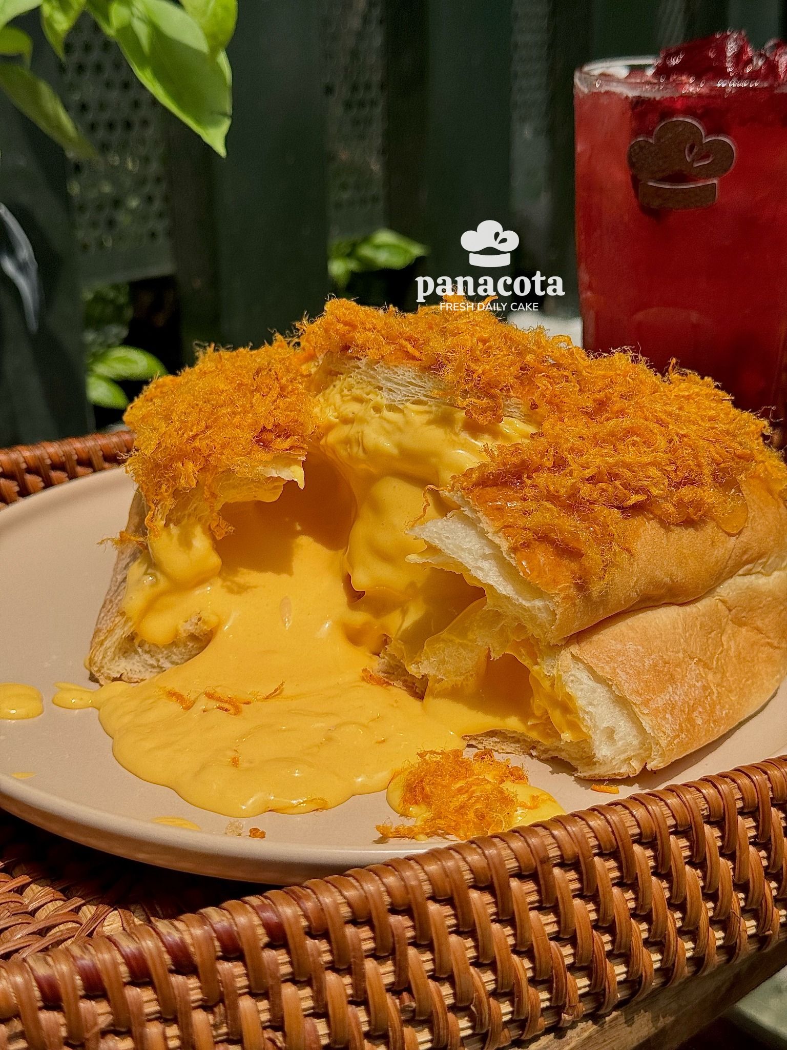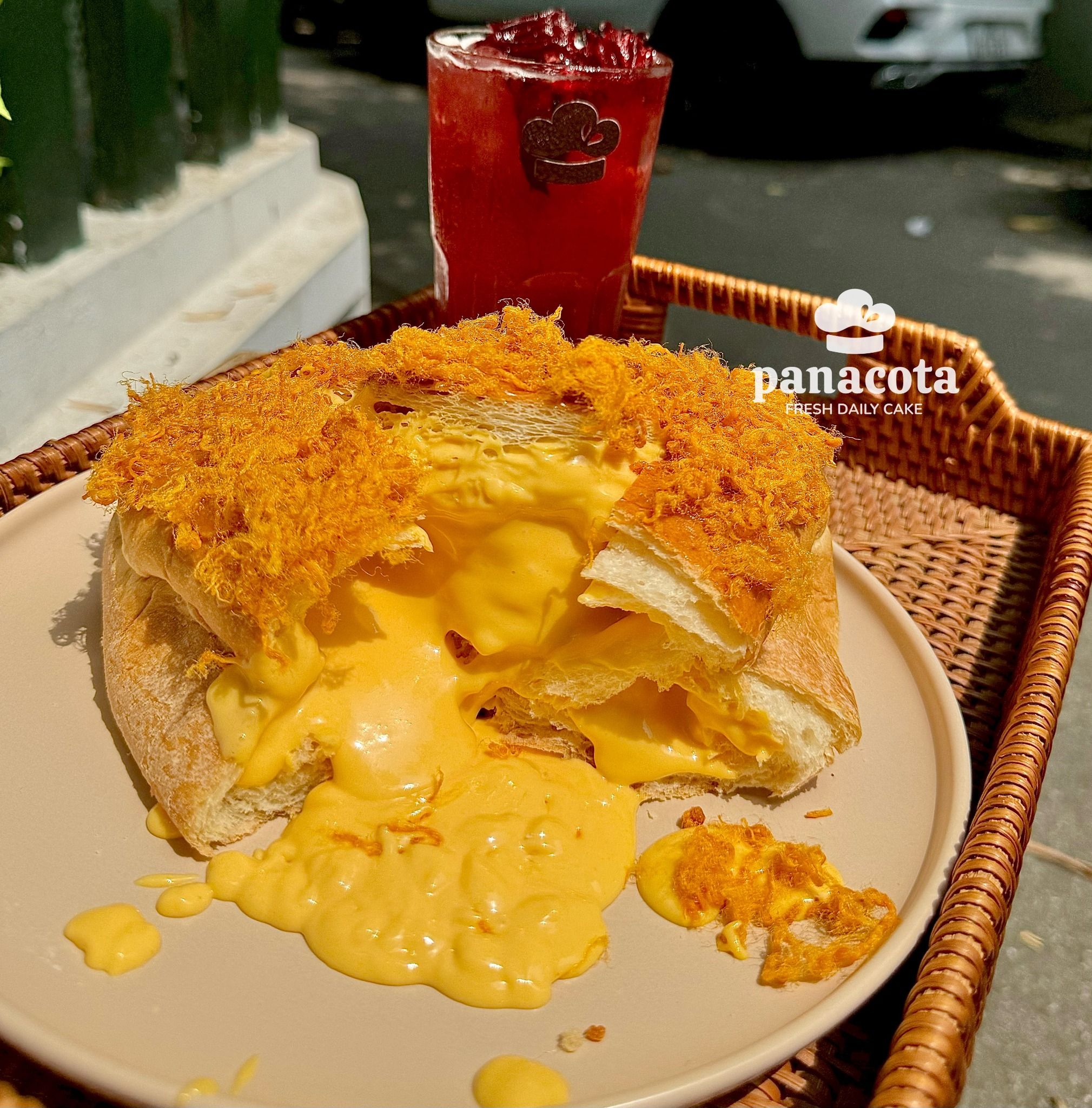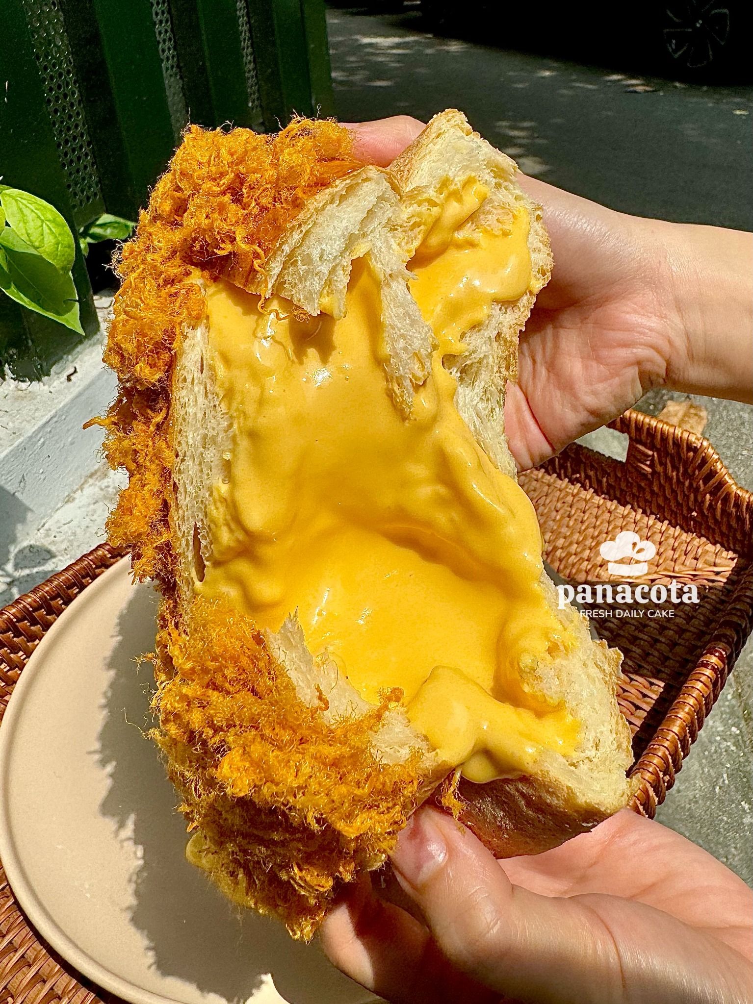 Bánh tươi mềm thơm, phủ bên trên là sốt kem trứng và chà bông mặn ngọt, tơi xốp, đậm ngậy, thơm lừng…