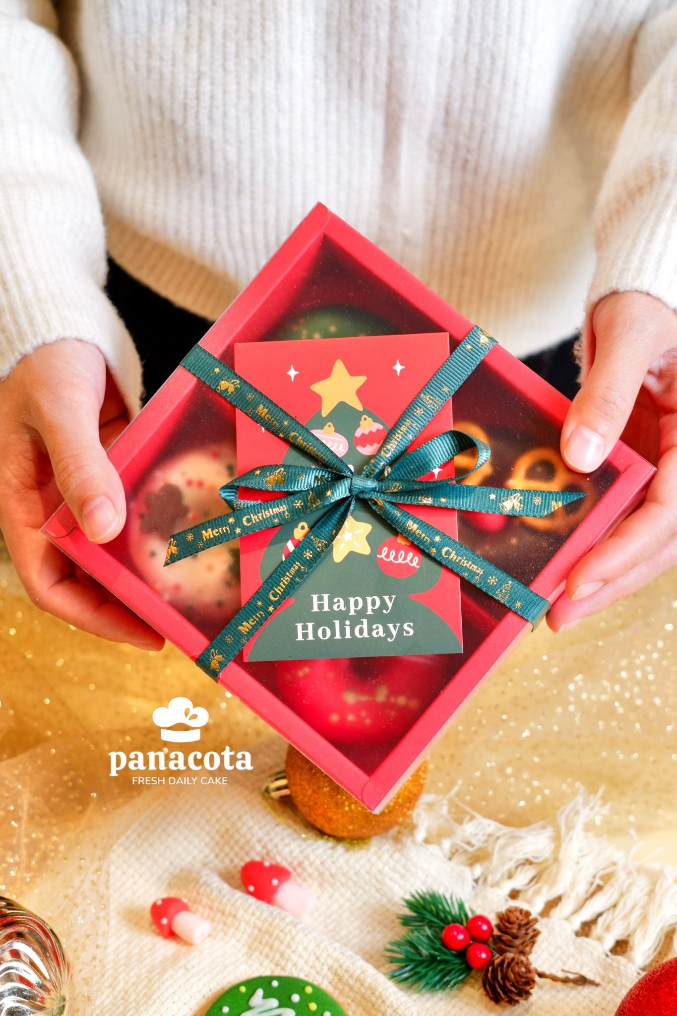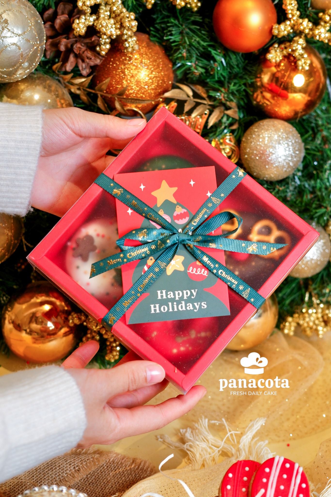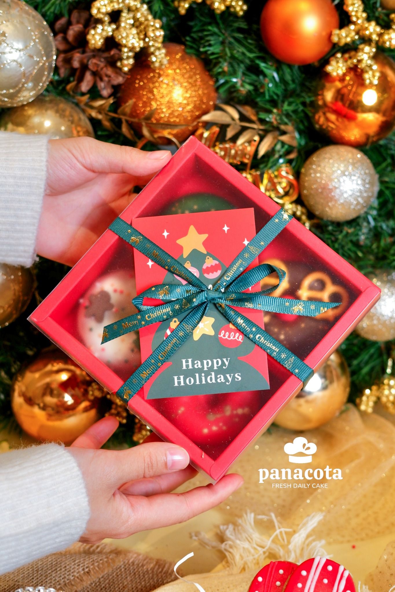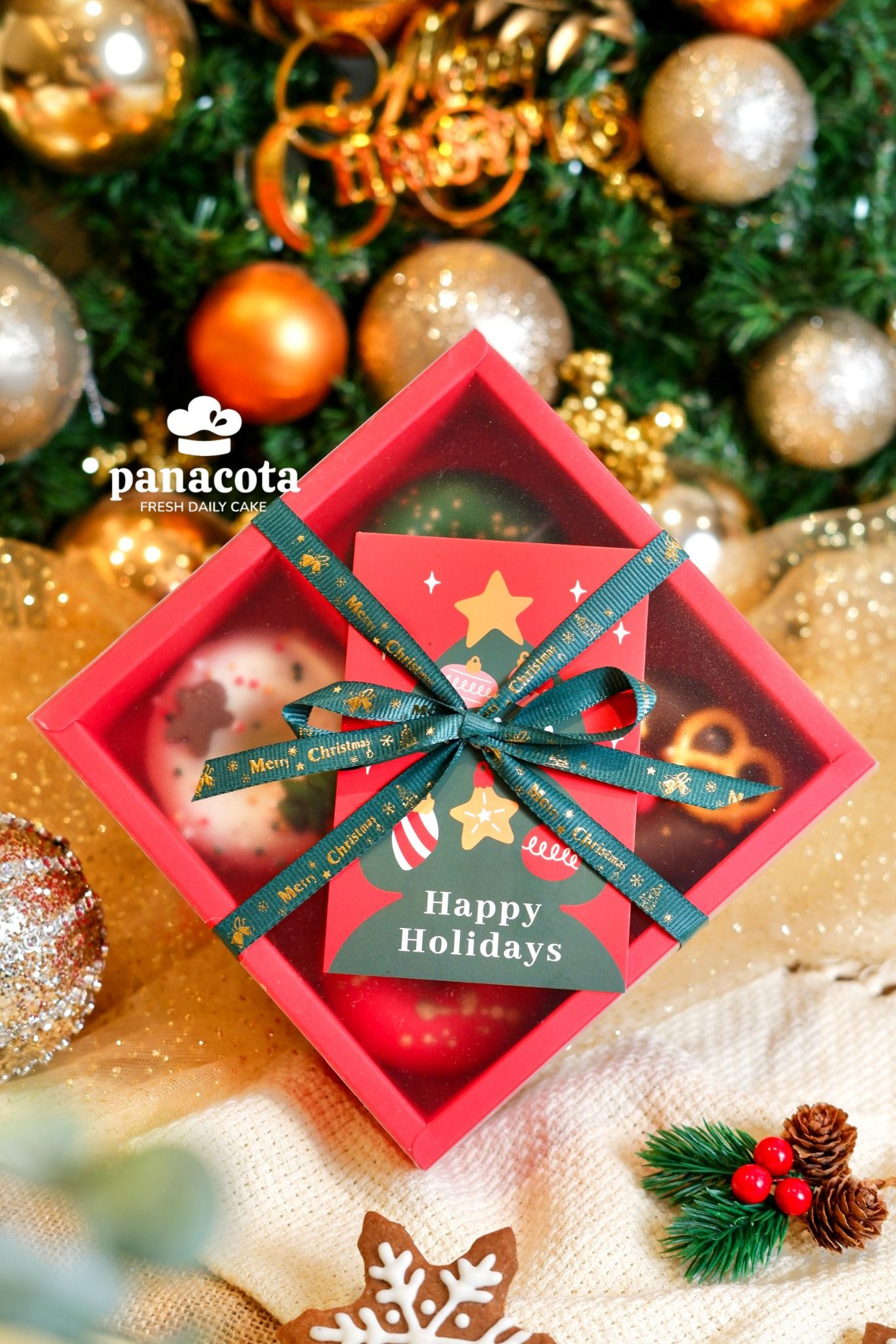 Cốt bánh hạnh nhân bơ béo ngậy mềm ẩm hoà quyện với lớp chocolate ngọt ngào thơm lừng mang tone màu đặc trưng của Noel : đỏ - xanh - trắng - nâu 🎄